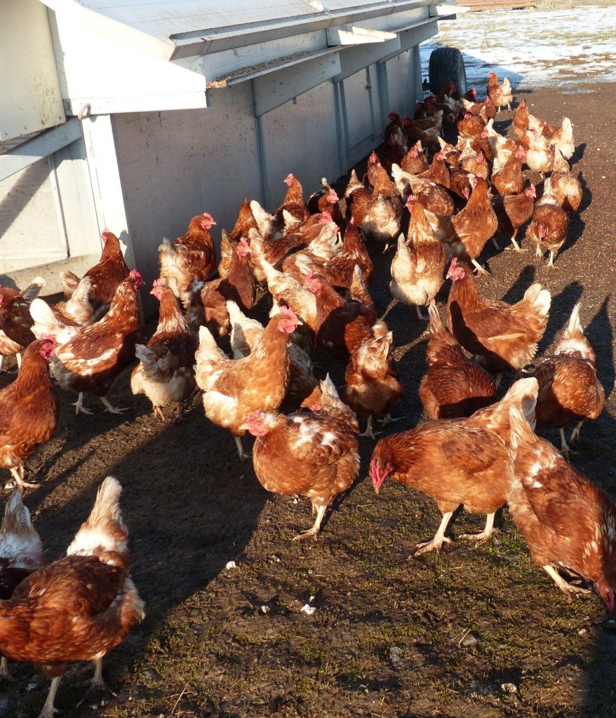 Aus dieser Idee wurden im Laufe der Zeit zwei Hühnermobile angeschafft, a) mit 440 St.- und b) 200 St. Hühner ganzjährig im Freiland zu halten.