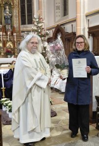 Es ist in der Pfarrei „St. Johannes d. T. “ Seyboldsdorf bereits Tradition am Ende der Christmette Ehrungen für Chormitglieder vorzunehmen. So auch in diesem Jahr. Stadtpfarrer Peter König rief nach den Vermeldungen Frau Martina Berr auf, vom Chor runter zu kommen. Dann wurde vom Geistlichen der Pfarreiengemeinschaft Vilsbiburg, Gaindorf und Seyboldsdorf die Urkunde, unterschrieben vom Diözesanbischof Dr. Rudolf Voderholzer und Diözesanmusikdirektor Christian Dostal vorgelesen. Martina Berr 35Jahre Chorsängerin. Für die Treue im Dienst der Kirchenmusik Dank und Anerkennung. Als kleine Anerkennung der Pfarrei wurde ein Blumenstock überreicht. Pfarrer König dankte für die lange ehrenamtliche Tätigkeit beim Chor und sagte: „Möge Ihre Stimme noch lange zur Ehre Gottes und zur Freude der Gottesdienstbesucher erklingen.“