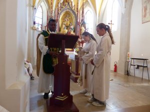 Es scheint so, dass Petrus ein besonderes Wohlwollen den Gläubigen der Filialkirche Oberenglberg gegenüber zeigt. Denn trotz der ungünstigen Wetterprognosen und pünktlich zum Fillialfest zeigte sich die Sonne und bescherte den Feiernden einen warmen Spätsommertag. Dies nahmen viele Leute zum Anlass, mit Auto, Fahrrad oder auch zu Fuß das Fest zu besuchen. Mit einem Gottesdienst, den Pfarrvikar Prosper zusammen mit vielen Gläubigen feierte, begann das Fest. In seiner Predigt griff er die neutestamentliche Stelle auf, in der Jesus das Verhalten der Leute und deren übertriebenes Geltungsbedürfnis kritisiert. Nach dem Gottesdienst bedankte sich der Pfarrvikar bei den mitfeiernden Gläubigen, dem Ehepaar Veronika und Lorenz Bauer für die musikalische Gestaltung des GD. Mit dem priesterlichen Segen endete der Gottesdienst. Danach trafen sich die Besucher vor der Kirche zum Fillialfest. Zahlreiche helfende Hände waren bemüht, den Hunger der Anwesenden zu stillen. Bei Schweinebraten, Bratensemmeln, Bratwürsten usw. fand jeder sein Mittagsessen. Der Ansturm auf Gegrilltes oder Süßes hielt noch lange an. Besonders das Kuchenangebot entwickelte sich zum magischen Anziehungspunkt. Man hatte die Qual der Wahl aus diesem leckeren Angebot das Richtige für seinen Geschmack zu finden. Auch für die Kinder gab es Unterhaltung. In der Hüpfburg konnte man seine Ausdauer testen und beim Dosenwerfern seine Zielgenauigkeit zeigen. Beide Angebote wurden da sehr oft angenommen. Um das Fest durchführen zu können, waren viele Helferhände nötig. Einen herzlichen Dank dafür an alle, an die Helfer am Grill, Verkäufer und Bedienungen am Getränkestand oder beim Kaffeeausschank und auch an die Frauen, die durch ihre Kuchenspenden das große Kuchenangebot erst möglich machten. Vergelt`s Gott