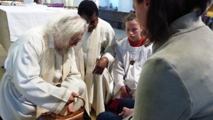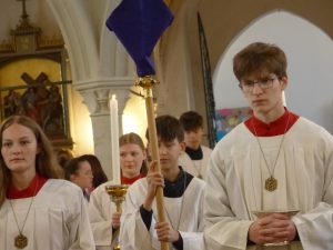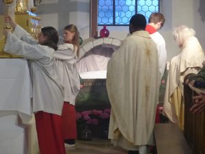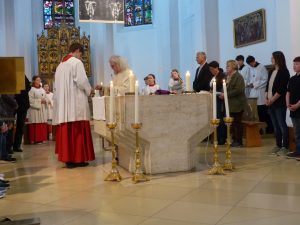 Mit der Feier des Palmsonntags trat die Pfarreiengemeinschaft in die Karwoche ein. Mit Palmprozessionen in den einzelnen Pfarreien wurde des feierlichen Einzugs und Empfangs Jesu in Jerusalem gedacht. Doch innerhalb kürzester Zeit hatte sich das „Hosianna“ des Palmsonntags in das „Kreuzige ihn“ gewandelt. Da Jesus wusste, dass er diesen Leidensweg gehen muss, traf er sich mit dem Apostel zu einem letzten Abendmahl in dessen Verlauf er seinen Jüngern den letzten Liebesdienst erweist und ihnen die Füße wäscht. Auch bei der gemeinsamen Feier der Pfarreiengemeinschaft in der Vilsbiburger Pfarrkirche wuschen Stadtpfarrer Peter König und Pfarrvikar Prosper Ngulu Ngulu 12 Personen aus den Pfarreien, die symbolisch für die 12 Apostel stehen, die Füße. In seiner Predigt stellte der Geistliche die Erzählung des Johannesevangeliums von der Fußwaschung in in den Vordergrund. Er führte aus, dass Johannes das Dienen an anderen und für andere unverzichtbar für das Miteinander der Menschen ist. Jesus selbst ist Beispiel für dieses Tun. Er, der sich nicht zu schade war sich mit Leuten abzugeben, die von anderen gemieden wurden, vollzieht an seinen Aposteln den niedrigsten Sklavendienst und forderte auf es nachzumachen Der Gründonnerstag zeichnet ein Christusbild, in dem in der größten Erniedrigung die göttliche Größe gezeigt wird. Dies sollte auch für alle Autoritäten in Kirche, Politik und Gesellschaft , Eltern und Lehrer gelten. Einmal vom hohen Ross herunter zu steigen wäre so manches mal durchaus angebracht und verändert die Sichtweise. Die Fußwaschung steht in enger Beziehung zum Geheimnis der Eucharistie. Jesus ist in zweifacher Weise gegenwärtig in der Eucharistie und im Menschen selbst. Das Ziel ist die Verbindung mit Christus und untereinander. Mit der Aufforderung „Handelt auch ihr so wie ich an euch gehandelt habe“, schloss Stadtpfarrer Peter König seine Predigt. Danach vollzog er, zusammen mit Pfarrvikar Prosper an den ausgewählten Pfarrangehörigen die Fußwaschung. Unter ihnen waren auch Erstkommunionkinder und Firmlinge, Vertreter des Pfarrgemeinderates und Angehörige der Pfarreien Gaindorf und Seyboldsdorf. In einer Gabenprozession wurden von Kindern und Erwachsenen Brot du Wein zum Altar gebracht. Am Ende des Gottesdienstes wurde der Tabernakel geöffnet und in einer Prozession die konsekrierten Hostien zum Nebenaltar gebracht . Bis 22 Uhr bestand noch die Möglichkeit der stillen Anbetung. Die musikalische Gestaltung übernahm der Kammerchor unter der Leitung der Kirchenmusikerin Strobl