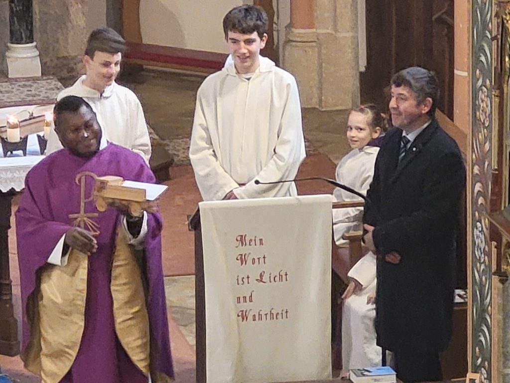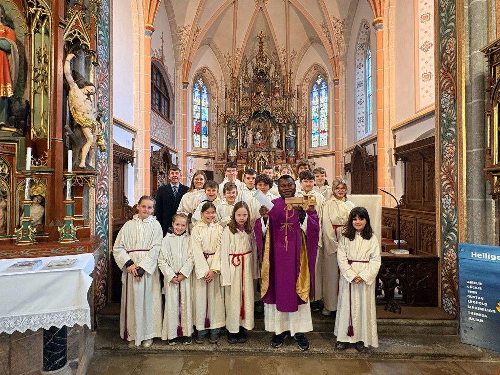 Am vergangenen Sonntag haben Mesner Glas Klaus und die Ministranten symbolisch einen kleinen Holzlastwagen an Pater Prosper für sein Waisenhausprojekt im Kongo überreicht. Er steht stellvertretend für eine ganz konkrete Hilfe: Mit den gesammelten Spenden wurde vor Ort ein kleiner Lastwagen angeschafft, der für die Kakao- und Bananenernte eingesetzt wird. Dieser wird dringend benötigt, um die Erträge zuverlässig zu transportieren und damit die Versorgung sowie die Finanzierung des Waisenhauses langfristig zu sichern.