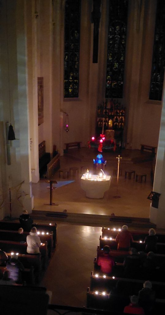 Ein Rorateamt im Dunklen in der Pfarrkirche unter Kerzenschein hielt Herr Präses, Pfarrer Peter König mit vielen Gottesdienstbesuchern. Im Pfarrsaal begann