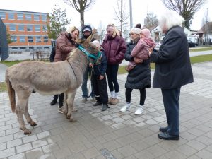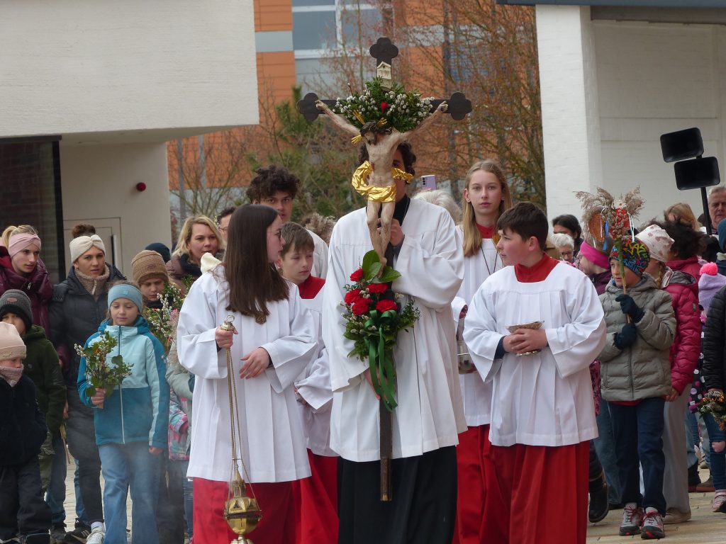 Schon am vergangenen Samstag feierte die Pfarrei Gaindorf den Beginn der Karwoche mit dem Palmsonntag. Viele Gläubige versammelten sich am Kriegerdenkmal zur Segnung der mitgebrachten Palmbuschen. Mit einem Gottesdienst wurde der Beginn der Karwoche gefeiert. Am Sonntag waren dann die Kinder und Erwachsenen in Vilsbiburg und Seyboldsdorf zur Teilnahme am Gottesdienst und Segnung der Palmbuschen eingeladen. In Seyboldsdorf wurde um 10.00 Uhr durch Pfarrvikar Prosper der Palmsonntag gefeiert. Der Familiengottesdienst in Vilsbiburg war besonders für die Kinder, auch für die Erstkommunionkinder gedacht und vorbereitet. Trotz des unbeständigen Wetters kamen viele Eltern und Kinder zu den Arkaden. Dort segnete Stadtpfarrer Peter König die mitgebrachten Palmbuschen. In einer kurzen Ansprache erklärte er, dass die Kinder auch für Jesus ein offenes Herz haben und bereit sind, Jesus in ihr Herz einziehen zu lassen. Wie schon gehabt,war auch in diesem Jahr ein echter Esel mit Namens Franz dabei. Dieser wurde natürlich von den Kindern umlagert. Bei der Prozession um die Pfarrkirche trug der Geistliche den roten Rauchmantel und wechselte vor dem Einzug in die Kirche zum roten Messgewand.Die Kinder waren an der Gestaltung des Gottesdienstes aktiv beteiligt. Bei der Lesung der Leidensgeschichte legten die Kinder jeweils Gegenstände vor den Altar. Z.B.Strick, Krug,Schwamm. Würfel. Usw. Auch bei den Fürbitten waren sie gefragt. Nach dem priesterlichen Segen beendete man den Gottesdienst mit einem stillen Auszug.